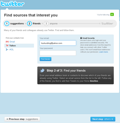 • The next step is to see whether your friends in Twitter. This will be visible through the address in your email if you use Gmail, Yahoo, Hotmail. You can skip this step by clicking Next at the bottom also